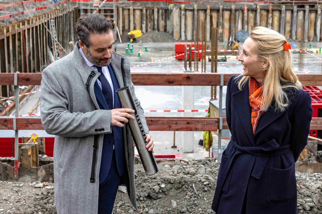 Mit der Grundsteinlegung des neuen Légére Hotels Lindau schreitet das Bauprojekt weiter voran. Zu diesem feierlichen Anlass trafen sich Lindaus Oberbürgermeisterin Dr. Claudia Alfons, Sven J. Köllmann, geschäftsführender Gesellschafter Fibona GmbH, Architekten, Fachplaner sowie politische und gesellschaftliche Vertreter der Stadt Lindau vor Ort. Die Tradition der Grundsteinlegung bei Bauprojekten ist reich an Symbolik – dazu gehört auch das Vergraben einer Zeitkapsel. Fotos: Christian Flemming