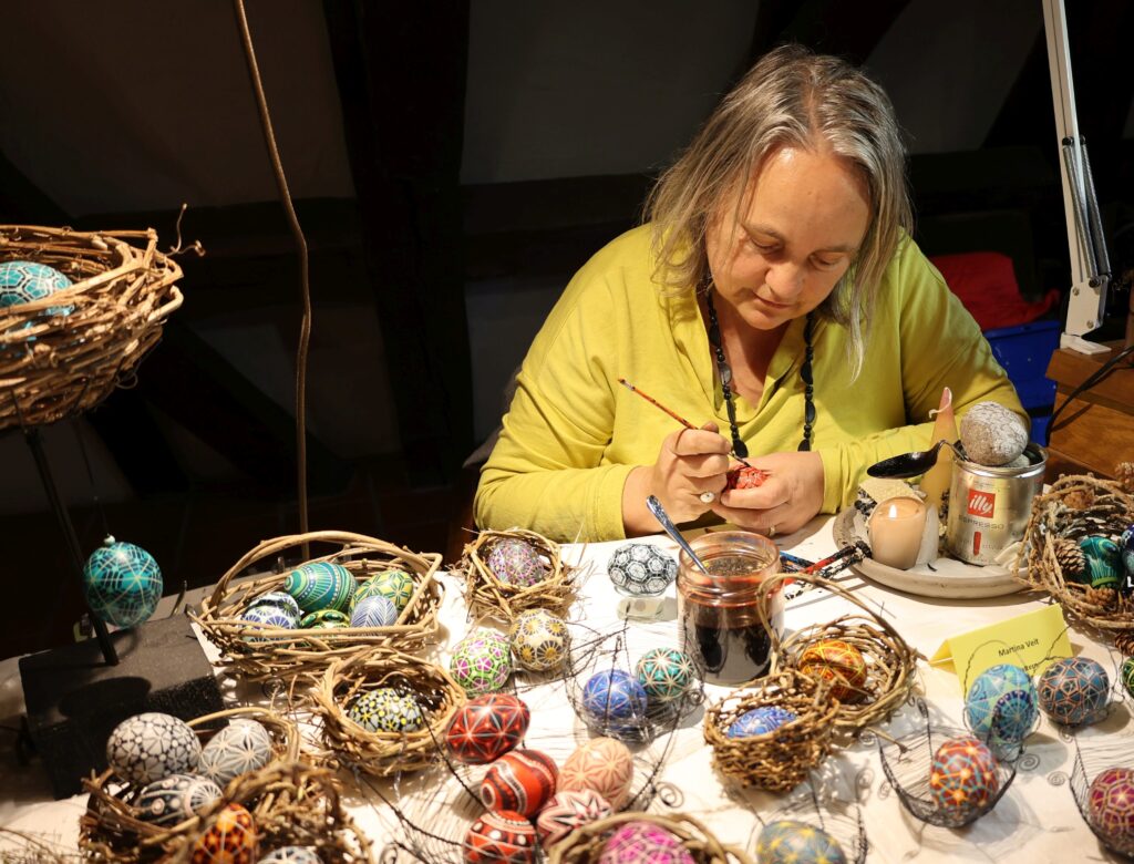 Mitten im großen Andrang des Wangener Ostereiermarktes zieht Martina Veit mit ruhiger Hand schwarze Linien über farbige Eier. Oft muss sie die Frage beantworten, wo die schwarzen Linien am Ende sind. Denn nichts bleibt davon. Im Gegenteil sind es weiße Linien, die auf wahlweise rotem, blauem, grünem oder vielfarbigem Untergrund dem Ei Gestalt geben. „Die schwarzen Linien entstehen, weil ich Wachs über einer Kerze erhitze. Das ist Ruß“, erklärt die Künstlerin aus Kaltern in Südtirol. Das Wachs deckt Schicht um Schicht die Farben ab, wodurch das Ei am Ende sein besonderes Bild bekommt. Es ist die klassische Batiktechnik, die aus Osteuropa, vor allem aus der Ukraine und aus dem transsilvanischen Teil Rumäniens bekannt ist. Doch Martina Veit überträgt die Technik in die Neuzeit und trifft damit auch einen Zeitgeschmack.